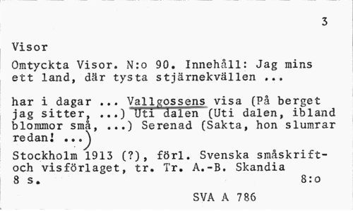 //// 3 //// Visor //// Omtyckta Visor. N:o 90. Innehåll: Jag mins ett land, där tysta stjärnekvällen ... //// har i dagar ... Vallgossens visa (På berget jag sitter, ...) Uti dalen (Uti dalen, ibland blommor små, ...) Serenad (Sakta, hon slumrar redan! .. //// Stockholm 1913 (?), förl. Svenska småskrift-och visförlaget, tr. Tr. A.-B. Skandia 8 s. 8:o //// SVA A 7 86 ////