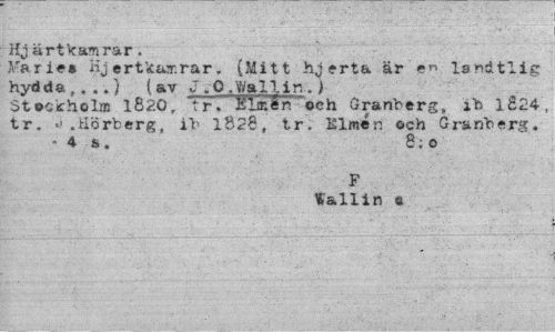 //// Hj ärtkamrar. //// Farien Hj ertkay.rar. (Mitt hjerta är e<"> landtlig hydda , . ..} (av J .0.Wall in..) //// Stockholm 1820, tr. TTia-.er. och Granberg, ib 1824, tr. .».Horberg, ib 1828, tr, ISlmén och öranberg. -4 b. 8;0 //// F //// Vallin ® ////