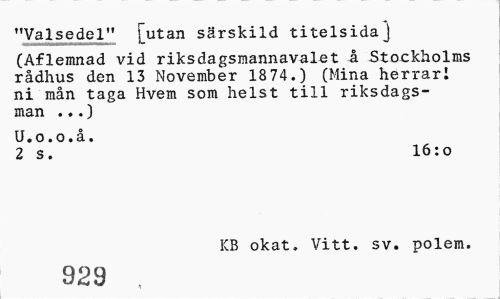 //// "Valsedel" [utan särskild titelsida] //// (Aflemnad vid riksdagsmannavalet å Stockholms rådhus den 13 November 18 74.) (Mina herrar! ni mån taga Hvem som helst till riksdagsman .».) //// U.o.o.å, //// 2 s. 16:o //// KB okat» Vitt. sv. polem. //// 929 , ////