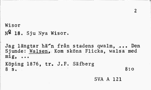 //// 2 //// Wisor //// n2 18. Sju Nya Wisor. //// Jag längtar hä^n från stadens qwalm, ... Den Sjunde: Walsen. Kom sköna Flicka, walsa med mig, ... //// Köping 1876, tr. J.F. Säfberg 8 s. 8:o //// SVA A 121 ////