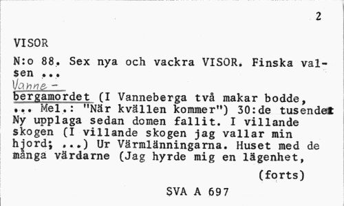 //// 2 //// VISOR //// N:o 88, Sex nya och vackra VISOR. Finska valsen ... //// \Jar)ne- - //// bergamordet (I Vanneberga två makar bodde, ,,. Mel,: "När kvällen kommer") 30:de tusendel Ny upplaga sedan domen fallit. I villande skogen (I villande skogen jag vallar min hjord; ...) Ur Värmlänningarna. Huset med de manga värdarne (Jag hyrde mig en lägenhet, //// (forts) //// SVA A 69 7 ////
