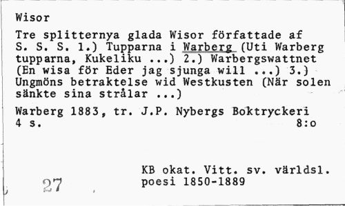 //// Wisor //// Tre splitternya glada Wisor författade af S. S. S. 1.) Tupparna i Warberg fUti Warberg tupparna, Kukeliku ...) 2.) Warbergswattnet (En wisa för Eder jag sjunga will ...) 3.) Ungmöns betraktelse wid Westkusten (När solen sänkte sina strålar ...) //// Warberg 1883, tr. J.P. Nybergs Boktryckeri 4 s. 8:o //// KB okat. Vitt. sv. världsl. 97 poesi 1850-1889 ////