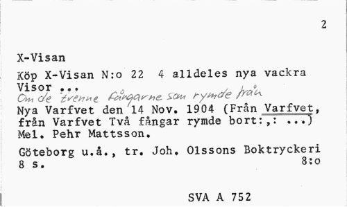 //// 2 //// X-Visan //// Köp X-Visan N:o 22 4 alldeles nya vackra Visor ... „ to //// O^i c/e ry<+?ae //// Nya Varfvet den 14 Nov. 1904 (Från Varfvet, från Varfvet Två fångar rymde bort:,: .77} Mel. Pehr Mattsson. //// Göteborg u.å., tr. Joh. Olssons Boktryckeri 8 s. 8:o //// SVA A 75 2 ////