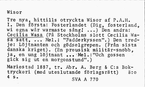 //// Wisor //// Tre nya, hittills otryckta Wisor af P.A.H. I. Den första: Fosterlandet (Dig, fosterland, wi egna wår warmaste sång.' ...) Den andra: Cecilia Wasa (På Stockholms slott Cecilia Wasa satt, ... Mel.: "Fadderkyssen".) Den tredje: Löjtnanten och gödselgrepen. (Från sista danska kriget). (Enpreusisk militär-snöbb, ja, en ung löjtnant .. Mel.: "Och gossen gick sig ut en morgonstund".) //// Mariestad 1887, tr. Abr, A. Berg & C:s Boktryckeri (med uteslutande förlagsrätt) 8:0 //// 4 S* SVA A 770 ////