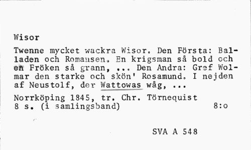 //// Wisor //// Twenne mycket wackra Wisor, Den Första: Balladen och Romansen» En krigsman så bold och efl Fröken så grann, ... Den Andra: Gref Woi-mar den starke och skön' Rosamund. I nejden af Neustolf, der Wattowas wåg, ... //// Norrköping 1845, tr. Chr. Törnequist 8 s. (i samlingsband) 8:0 //// SVA A 54 8 ////