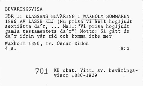 //// BEVÄRINGSVISA //// FÖR 1: KLASSENS BEVÄRING I WAXHOLM SOMMAREN 1896 AV LASSE KEJ (Nu prisa vi helt högljudt sextiåtta da^r, ... Mel.:"Vi prisa högljudt gamla testamentets da^r") Motto: Så gatt de da"r ifrån vår tid och komma icke mer. //// Waxholm 1896, tr. Oscar Didon 4 s. 8:o //// 7Q1 KB okat. Vitt. sv. bevärings- //// visor 1880-1939 ////