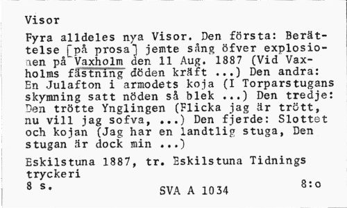 //// Visor //// Fyra alldeles nya Visor. Den första: Berättelse [på prosa] jemte sång öfver explosionen på Vaxholm den 11 Aug. 188 7 (Vid Vaxholms fästning döden kräft ...) Den andra: En Julafton i armodets koja (I Torparstugans skymning satt nöden så blek ...) Den tredje: Den trötte Ynglingen (Flicka jag är trött, nu vill jag sofva, ...) Den fjerde: Slottet och kojan (Jag har en landtlig stuga, Den stugan är dock min ...) //// Eskilstuna 1887, tr. Eskilstuna Tidnings tryckeri //// 8 s* SVA A 1034 8:0 ////