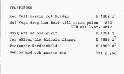 //// VEGAFÄRDEN //// Med full maskin mot Norden E 1882 x2 //// Med Vega drog han bort till norra polen 1880 //// LUB skill.tr. unik //// Evig ära de oss givit E 1881 t //// Jag hälsar dig blågula flagga E 1888 i5 //// Professor Nordensköld E 1882 b? //// Mandom mod och morske män SVA A 766 ////