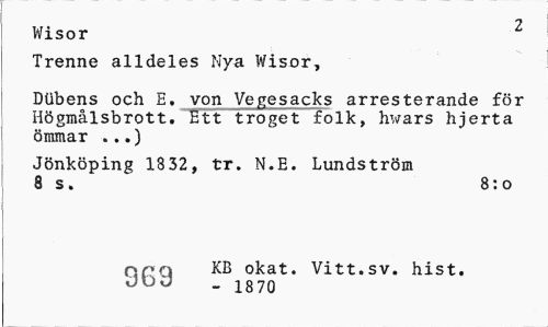 //// Wisor 2 //// Trenne alldeles Nya Wisor, //// Dtibens och E. von Vegesacks arresterande för Högmålsbrott. Ett troget folk, hwars hjerta ömmar ...) //// Jönköping 1332, tr. N.E. Lundström 8 s. 8:o //// qpq KB okat. Vitt.sv. hist. //// _ 2870 ////