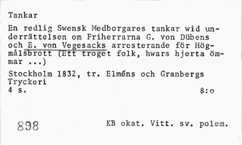 //// Tankar //// En redlig Swensk Medborgares tankar wid underrättelsen om Friherrarna G. von Dtibens och E. von Vegesacks arresterande för Högmålsbrott [Ett troget folk, hwars hjerta ömmar ...) //// Stockholm 1832, tr. Elméns och Granbergs Tryckeri //// 4 s. 8:0 //// <y ejc KB okat. Vitt. sv. polem. ////