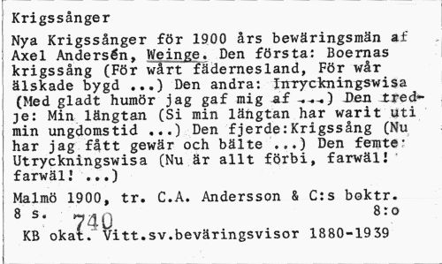 //// Krigssånger //// Nya Krigssånger för 1900 års bewäringsmän af Axel Andersén, Weinge. Den första: Boernas krigssång (För wårt fädernesland, För wår älskade bygd ...) Den andra: iirryckningswisa (Med gladt humör jag gaf mi g 3l f -.. -.) Den tred*-je: Min längtan (Si min längtan har warit uti min ungdomstid ...) Den fjerde:Krigssång (Nu har jag fått gewär och bälte ..•) Den femte* Utryckningswisa (Nu är allt förbi, farwälJ farwäll ...) //// Malmö 1900, tr. C.A. Andersson & C:s boktr. 8 s. ^^^ 8:o //// KB okat. Vitt.sv.beväringsvisor 1880-1939 ////