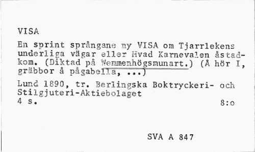 //// VISA //// En sprint språngane ny VISA om Tjarrlekens underliga vägar eller Hvad Karnevalen åstadkom. (Diktad på Wemmenhögsmunart.) (Å hör I, gräbbor å pågabella, .,.") //// Lund 1890, tr. Berlingska Boktryckeri- och Stilgjuteri-Aktiebolaget //// 4 s. 8:0 //// SVA A 84 7 ////