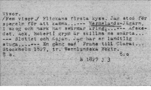 //// Visor. //// /Fem visor./ Flickans första kyss. Jag stod för spegeln för att kamma...-— ^tepa^Iaffis-Jägarn. i skog och mark han swärmar kxing^TTt"--- Af skedet. -ick. Hot ert l grym är skillna ns smärta... — • Slottet och Kojan. Jag har er landtlig stuga»,..*-- En gång sad' Frans till Clara;... St ockbolrs l'rii-7, tr. Wennlund eka Boktr. B s. ¦ - . ' 8; o //// - - ; & .1627 j 3 • ////