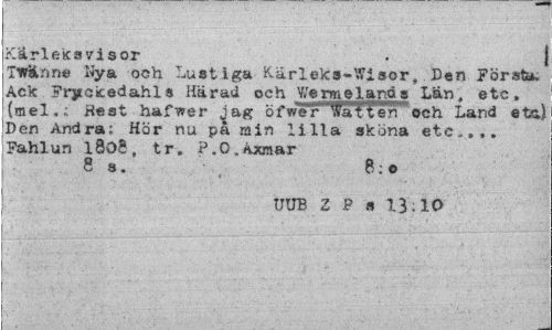//// Kärleksvisor //// Iwfcnne Nya och Lustiga Kärleks-Wisor, Den Första, Ack Fryckedahls Härad och Wermelanda Lan, etc. (mel,; Besthafwer jag öfwer 'falt en och Land eta) Den Andra; Hor nu pa min lilla sköna etc,... Fahlun 1808, tr. P.O.Axraar //// 8 s. 8:0 //// UUB 2 P a 13; 10 ////