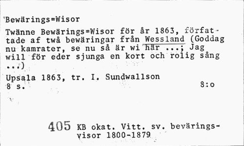 //// 6Bewärings=Wisor //// Twänne Bewärings=Wisor för år 1863, författade af twå bewäringar från Wessland (Goddag nu kamrater, se nu så är wi här Jag //// will för eder sjunga en kort och rolig sång //// Upsala 1863, tr. I. Sundwallson 8 s. 8:o //// 'V //// -t-1 KB okat. Vitt. sv. bevärings- //// 40a visor 1800-1879 ////