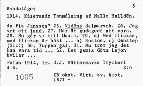//// 3 //// Bondetåget //// 1914. Kåserande Tonmålning af Nalle Halidén. //// du Fia Jansson? 25. Vidéns dalmarsch. 26. Jag vet ett land. 27. Här är gudagodt att vara. 28. Nu går vi till Maxim. 29. a) Med flickan, med flickan är bäst ... b) Boston, c) Oenstep (Sic!) 30, Tuppen gal. 31. Nu tror jag det kan vara tid ... 32. Det gamla Göta Lejon hvilar ... //// Falun 1914, tr. O.J. Sättermarks Tryckeri 4 s. 8:o //// KB okat. Vitt. sv. hist. ////