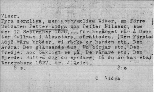 //// Visor. //// Fyra sorgliga, mer uppbyggliga "Åiser, om förre j Soldaten Petter Widga cch Petter Nilsson, som den 12 SepTembeT"TF2F,...för begånget rkr.. L Doc~ tor Kullman i Algustory, afrättaöes. (Den Första» Adjö rara broder, wi räcka er "handen etc. Den Andra; Den glänsande dare Btf börjar etc. Den Tredje. Ack ömkligt ae pa, De rånare etc. Den Fj erde; Bättra dig du syndare. Då du än kan etc.) Wenersborsr 1827, .tr, J.Qyi st . //// P ». 8;o //// C V ic ga ////