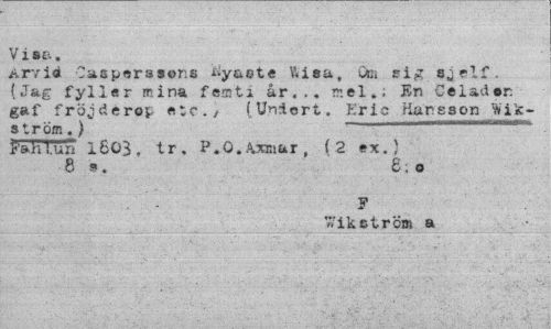 //// V i »&. //// Arvid Casperssors Nyaste Väsa, Gm sig sjelf. (Jag fyller mina fernti år... mel.; En Celader gaf fröjderop etc. , (Uniert. Eric Hansson Wikström . ) ... //// PäFTun 1603, tr, P.O.Axsiur, (2 ex.) //// 8 £;o //// F //// likström a ////
