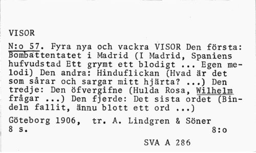 //// VISOR //// N:o 57. Fyra nya och vackra VISOR Den första: Bombattentatet i Madrid (I Madrid, Spaniens hufvudstad Ett grymt ett blodigt ... Egen melodi) Den andra: Hinduflickan (Hvad är det som sårar och sargar mitt hjärta? ...) Den tredje: Den öfvergifne (Hulda Rosa, Wilhelm frågar ...) Den fjerde: Det sista ordet (Bindeln fallit, ännu blott ett ord //// Göteborg 1906, tr. A. Lindgren & Söner 8 s. 8:o //// SVA A 286 ////