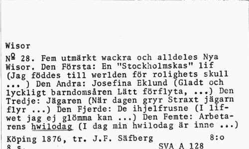 //// Wisor //// N- 28. Fem utmärkt wackra och alldeles Nya Wisor. Den Första: En "Stockholmskas" lif (Jag föddes till werlden för rolighets skull ... ) Den Andra: Josefina Eklund (Gladt och lyckligt barndomsåren Lätt förflyta, ...) Den Tredje: Jägaren (När dagen gryr Straxt jägarn flyr ...) Den Fjerde: De ihjelfrusne (I lif-wet jag ej glömma kan ...) Den Femte: Arbeta-rens hwilodag (I dag min hwilodag är inne . é.) //// Köping 1876, tr. J.F. Säfberg 8:0 //// n — r»t t k a i ^ o ////