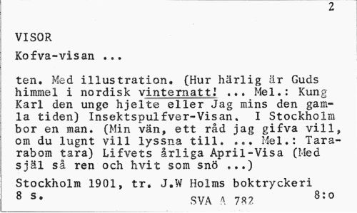 //// VISOR //// Kofva-visan ... //// ten. Med illustration. (Hur härlig är Guds himmel i nordisk vinternatt.' ... Mel.: Kung Karl den unge hjelte eller Jag mins den gamla tiden) Insektspulfver-Visan. I Stockholm bor en man. (Min vän, ett råd jag gifva vill, om du lugnt vill lyssna till. ... Mel.: Tara-rabom tara) Lifvets årliga April-Visa (Med själ så ren och hvit som snö ...) //// Stockholm 1901, tr. J.W Holms boktryckeri //// 8 S. C;yA A 8:0 ////