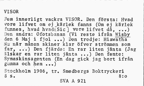 //// VISOR //// rera innerligt vackra VISOR. Den första: Hvad vore lifvet om ej Jkärlek fanns (Om ej kärlek funnes, hvad hvadfSic] vore lifvet då, ...) Den andra: Ofotsbanan (Vi reste ifrån Wisby den 6 Maj i fiol ...) Den tredje: Hiawätha Nu när månen skiner klar öfver strömmen som fä fj • • • ) Den fjärde: En rar liten jänta (Jag älskar en rar liten jänta ...) Den femte: Symaskinsagenten (En dag gick jag bort ifrån gumma och hem ...) //// Stockholm 1906, tr. Smedbergs Boktryckeri 3 s. 8:o //// SVA A 9 21 ////
