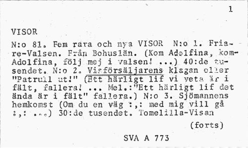 //// 1 //// VISOR //// N:o 81, Fem rara och nya VISOR N:o 1. Fria-re-Valsen. Från Bohuslän. (Kom Adolfina, kom-Adolf in a, följ mej i valsen.' ...) 40:de tu-sendet» N:o 2„ Vifförsäljarens klagan eller "Patrull ut.'" (Btt Härligt lif vi veta är i fält, fallera.' ... Mel.: "Ett härligt lif det ända är i fält" fallera.) N:o 3. Sjömannens hemkomst (Om du en väg :,: med mig vill gå . 30: de tusendet. Tomelilla-Visan //// (forts) //// SVA A 773 ////