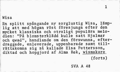 //// 1 //// Wisa //// En splitt spångande ny sorglustig Wisa, lämplig att med högan röst föresjunga efter den mycket klassiska och otroligt populära melodien: "På blomsterklädd kulle satt Hjalmar och qwad", handlande om den förswunna, efter-draggade, enleverade, uppenbarade samt tillrättakomna sig så kallade Elsa Pettersson, diktad och hopgjord af Alma Rek, wismakare //// Cforts) //// SVA A 48 ////