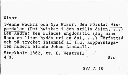 //// Wisor //// Twenne wackra och Nya Wisor. Den Första: Wis-perdalen (Det hwiskar i den stilla dalen, ...) Den Andra: Den Blindes ungdomstid (Jag mins ännu en liten hydda uti en dal, .,.) Författad och på trycket inlemnad af f.d. Kopparslaga-1 ren numera blinde Johan Lindwall. //// Stockholm 1862, tr. E. Westrell 4 s. 8:o //// SVA A 19 ////