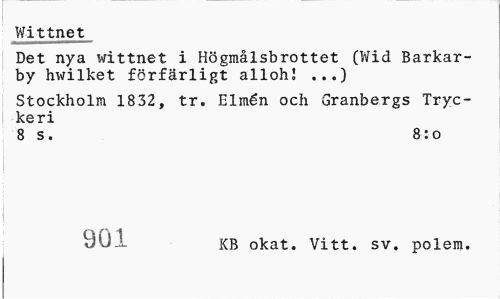 //// Wittnet //// Det nya wittnet i Högmålsbrottet (Wid Barkar-by hwilket förfärligt allohl ...) //// Stockholm 1832, tr. Elmén och Granbergs Tryckeri //// 8 s. &:o //// KB okat. Vitt. sv. polem. ////