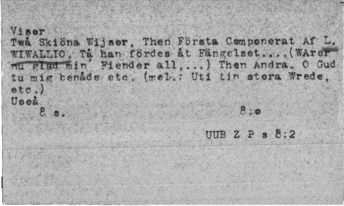 //// Vi »or //// T*ra Skiöna Wijsor, Then Första Compenerat Af L. WIWALLIO . Ta han fördes åt Fängelset... . (WAröT"' Uti flSW Sin' Fiender all,.,.) Then Andra. C Gud tu mii» fcenåde eto . (mel'.r Uti tin stora Wrede, •te.) . //// Uooå //// e s. b ip //// UUB Z F s 8:2 ////