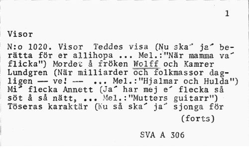 //// 1 //// Visor //// N:o 1020. Visor Teddes visa (Nu ska" ja1' berätta för er allihopa ... Mel.:"När mamma va" flicka") Mordet å fröken Wolff och Kamrer Lundgren (När milliarder och folkmassor dagligen — ve.' — ... Mel.:"Hjalmar och Hulda") Mi" flecka Annett (Ja-* har mej e" flecka så söt å så nätt, ... Mel.:"Mutters guitarr") Töseras karaktär (Nu så ska" ja" sjonga för //// (forts) SVA A 306 ////