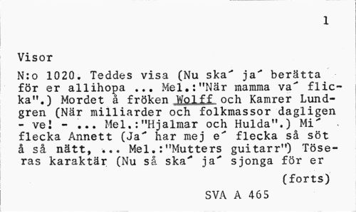//// 1 //// Visor //// N:o 1020. Teddes visa (Nu ska" ja" berätta för er allihopa ... Mel.:"När mamma va" flicka".) Mordet å fröken J2&LLL och Kamrer Lundgren (När milliarder och folkmassor dagligen - ve I - ... Mel.:"Hjalmar och Hulda".)oMi" flecka Annett (Ja" har mej e" flecka så söt å så nätt, ... Mel.:"Mutters guitarr") Töseras karaktär (Nu så ska" ja" sjonga för er //// (forts) //// SVA A 46 5 ////