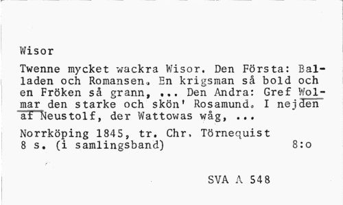 //// Wisor //// Twenne mycket wackra Wisor. Den Första: Balladen och Romansen* En krigsman så bold och en Fröken så grann, ... Den Andra: Gref Wol-mar den starke och skön1 Rosamund, I nejden af Neustolf, der Wattowas wåg, ... //// Norrköping 1845, tr. Chr. Törnequist 8 s. (i samlingsband) 8:0 //// SVA A 54 8 ////