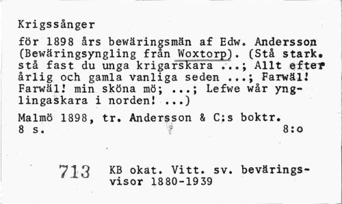 //// Krigssånger //// för 1898 års bewäringsmän af Edw. Andersson (Bewäringsyngling från Woxtorp). (Stå stark, stå fast du unga krigarskara Allt eftef //// årlig och gamla vanliga seden ...; Farwäli Farwäl.1 min sköna mö; ...; Lefwe wår ynglingaskara i nordenl ...) //// Malmö 1898, tr. Andersson & C;s boktr. 8 s. f 8:o //// 713 KB okat. Vitt. sv. bevärings-visor 1880-1939 ////