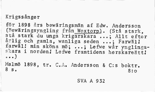 //// Krigssånger //// för 1898 års bewäringsmän af Edw. Andersson (Bewäringsyngling från Woxtorp). (Stå stark, stå stark du unga krigarskara ... ; Allt efter årlig och gamla, wanliga seden ...; FarwälJ farwäl.' min sköna mö; Lefwe wår yriglinga- //// skara i norden] Lefwe framtidens herskareätt.1 //// 9 • • ) //// Malmö 1898, tr. C.A. Andersson & C:s boktr. 8 s, 8:o //// SVA A 9 32 ////