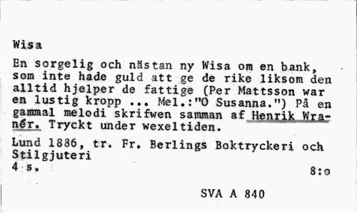 //// Wisa //// En sorgeli g och nästan ny Wisa om en bank, som inte hade guld att ge de rike liksom den alltid hjelper de fattige (Per Mattsson war en lustig kropp ... Mel.:"O Susanna.") På en gammal melodi skrifwen samman af HenyjK Wxar nér. Tryckt under wexeltiden. //// Lund 1886, tr. Fr. Berlings Boktryckeri och Stilgjuteri //// 4 s. 8:0 //// SVA A 840 ////