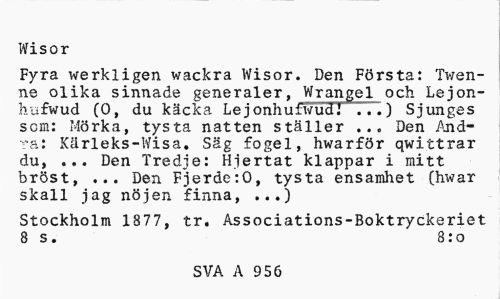 //// Wisor //// Fyra werkligen wackra Wisor. Den Första: Twen-ne olika sinnade generaler, Wrangel och Lejon-hufwud (0, du käcka LejonhufwudJ ...) Sjunges som: Mörka, tysta natten ställer ... Den Andra: Kärleks-Wisa. Säg fogel, hwarför qwittrar du, ... Den Tredje: Hjertat klappar i mitt bröst, ... Den Fjerde:0, tysta ensamhet (hwar skall jag nöjen finna, ...) //// Stockholm 1877, tr. Associations-Boktryckeriet 8 s. 8:o //// SVA A 956 ////