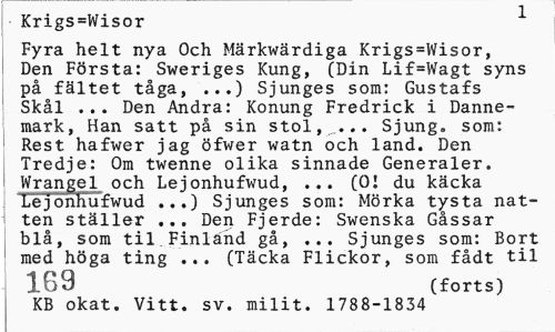 //// Krigs=Wisor 1 //// Fyra helt nya Och Märkwärdiga Krigs=Wisor, Den Första: Sweriges Kung, (Din Lif=Wagt syns på fältet tåga, ...) Sjunges som: Gustafs Skål ... Den Andra: Konung Fredrick i Danne-mark, Han satt på sin stol,„... Sjung, som: Rest hafwer jag öfwer watn och land. Den Tredje: Om twenne olika sinnade Generaler. Wrangel och Lejonhufwud, ... (O! du käcka Lejönhufwud ...) Sjunges som: Mörka tysta natten ställer ... Den Fjerde: Swenska Gåssar blå, som til Finland gå, ... Sjunges som: Bort med höga ting ... (Täcka Flickor, som fådt til //// 169 (forts) //// KB okat. Vitt. sv. milit. 1788-1834 ////