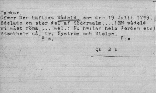 //// Pankar. //// .fwer Ben häftiga Wad eld. aom der» 19 Jul i i 1759, ödelade en stor d eT aF Sode ra a 1 ?n ,,..(EN wådeld iwi nast röna,... mel.: Nu hwilar hela Jorden etc) Stockholm uå, tr. Nys trons och Stolpe. //// 8 8: o //// qb 2 b ////