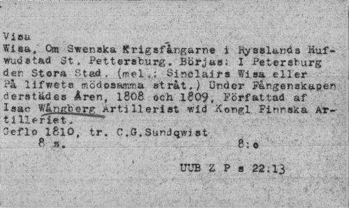 //// Viou //// Wisa, Om Swenska Krigsfångarna i Rysslands Huf-wudstad St. Pettersburg. Börjas; I Petersburg den Stora Stad. (mel,; Sinclairs Visa eller På lifwete? mödosamma stråt.) Under Fångenskapen derstädes Aren, 1808 och 1809, Författad af Isac ffångfcerg Artillerist wid Xongl Finnska Artilleriet. //// Gefle l8lO, tr. C.G.Sundqwist //// 85. 8:0 //// UwB Z P a 22;13 ////
