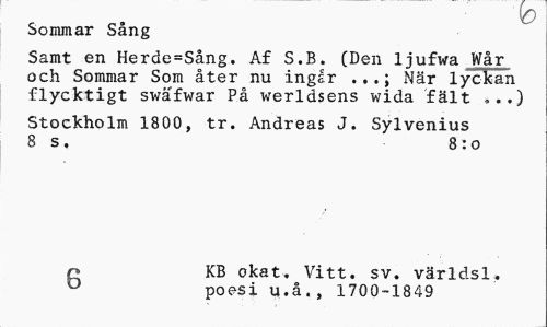 //// Sommar Sang //// Samt en Herde=Sång. Af S.B. (Den ijufVa Wår och Sommar Som åter nu ingår När lyckan //// flycktigt swafwar På werldsens wida fält ,..) //// Stockholm 1800, tr. Andreas J. Sylvenius 8 s, 8:0 //// n KB okat. Vitt. sv. världsl. //// 0 poesi u.å., 1700-1849 ////