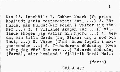 //// 1 //// N:o 12. Innehåll: 1. Gubben Noack (Vi prisa högljudt gamla testamentets dar, ...) 2. För Hulda, min Hulda!(När solen i vester sig sänker ...) 3. I villande skogen jag ...(I villande skogen jag vallar min hjord ...) 4. Gerda, min lilla Gerda (Jag älskar dig i nöd och lust, ...) 5. Våren (Glad såsom fogeln i morgonstunden ...) 6. Trubadurens dödssång (Hveia sjöng jag för? Hon var ..,) Edvards dödssång (Farväl, mitt hemland i fjällrik Nord.' Mel.: //// (forts) //// SVA A 4 7?, ////