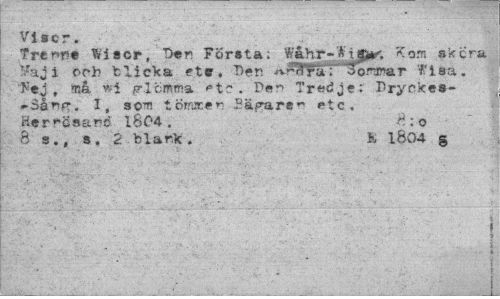 //// •¦—-V1. *---— //// Vi ser. //// Trennt Wisor, Den Första; Kom sköra //// Faji och blicka ete, Den k^Sfwt^^Smr Wisa. "Nej, må wi p-lcmma Den Tredje: Pryckes- //// »Sång. I, som tomten S&parsn etc. Hemce&nd 1804. 8:0 //// 8 s., s. 2 blank. fc 1804 § //// I //// "" • ' i : | ////