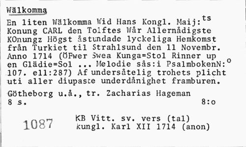 //// Welkomma //// En liten Wälkomma V/id Hans Kongl. Maij:ts Konung CARL den Tolftes Wår Allernådigste KOnungz Högst åstundade lyckeliga Hemkomst från Turkiet til Strahlsund den 11 Novembr. Anno 1714 (ÖFwer Swea Kunga=Stol Rinner up en Glädie=Sol ... Melodie sås:i PsalmbokenN: 107. ell:287) Af undersåtelig trohets plicht uti aller diupaste underdånighet framburen. //// Götheborg u.å., tr. Zacharias Hageman 8 s. 8:o //// . n0t-i KB Vitt. sv. vers (tal) lU6 1 kungl. Karl XII 1714 (anon) ////