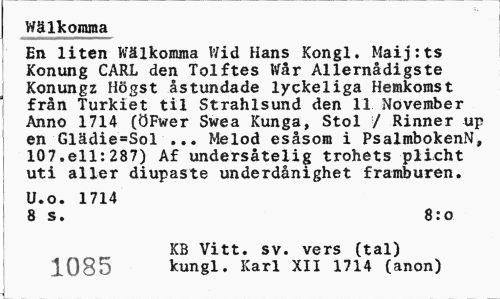 //// Welkomma //// En liten Wälkomma Wid Hans Kongl. Maij:ts Konung CARL den Tolftes Wår Allernådigste Konungz Högst åstundade lyckeliga Hemkomst från Turkiet til Strahlsund den 11 November Anno 1714 {ÖFwer Swea Kunga, Stol / Rinner up en Glädie=Sol ... Melod esåsom i PsalmbokenN, 107.ell:287) Af undersåtelig trohets plicht uti aller diupaste underdånighet framburen. //// U.o. 1714 //// 8 s. 8:o //// KB Vitt. sv. vers (tal) 1085 kungl. Karl XII 1714 (anon) ////