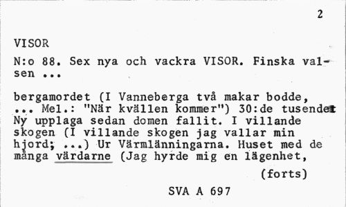 //// 2 //// VISOR //// N:o 88. Sex nya och vackra VISOR. Finska valsen ... //// bergamordet (I Vanneberga två makar bodde, ... Mel.: "När kvällen kommer") 30;de tusendel Ny upplaga sedan domen fallit. I villande skogen (I villande skogen jag vallar min h^ord; ...) Ur Värmlänningarna. Huset med de manga värdarne (Jag hyrde mig en lägenhet, //// (forts) //// SVA A 69 7 ////