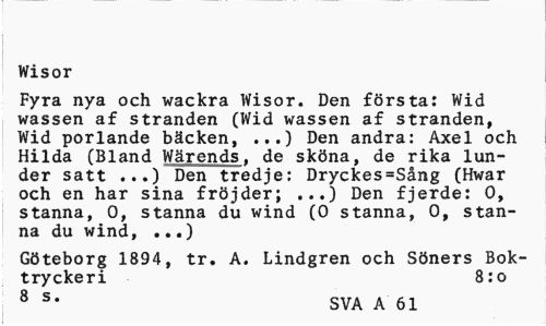 //// Wisor //// Fyra nya och wackra Wisor. Den första: Wid wassen af stranden (Wid wassen af stranden, Wid porlande bäcken, ...) Den andra: Axel och Hilda (Bland Wärends. de sköna, de rika lun-der satt ...) Den tredje: Dryckes=Sång (Hwar och en har sina fröjder; ...) Den fjerde: 0, stanna, 0, stanna du wind (0 stanna, 0, stanna du wind, ...) //// Göteborg 1894, tr. A. Lindgren och Söners Boktryckeri 8:o //// 8 s- SVA A 61 ////