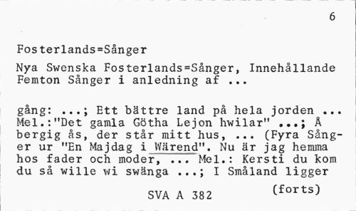 //// 6 //// Fosterlands=Sånger //// Nya Swenska Fosterlands=Sånger, Innehållande Femton Sånger i anledning af ... //// gång: ...; Ett bättre land på hela jorden ... Mel.:"Det gamla Götha Lejon hwilar" Ä //// bergig ås, der står mitt hus, ... (Fyra Sånger ur "En Majdag i Wärend". Nu är jag hemma hos fader och moder,... Mel.: Kersti du kom du så wille wi swänga ...; I Småland ligger //// SVA A 382 <£orts) ////
