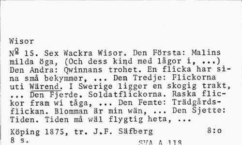 //// Wisor //// N- 15. Sex Wackra Wisor. Den Första: Malins milda öga, (Och dess kind med lågor i, ...) Den Andra: Qwinnans trohet. En flicka har sina små bekymmer, ... Den Tredje: Flickorna uti Wärend. I Swerige ligger en skogig trakt» ... Den Fjerde. Soldatflickorna. Raska flickor fram wi tåga, ... Den Femte: Trädgårdsflickan. Blomman är min wän, ... Den Sjette: Tiden. Tiden må wäl flygtig heta, ... //// Köping 1875, tr. J.F. Säfberg 8:0 //// 8 S . r>ir* « i i n ////